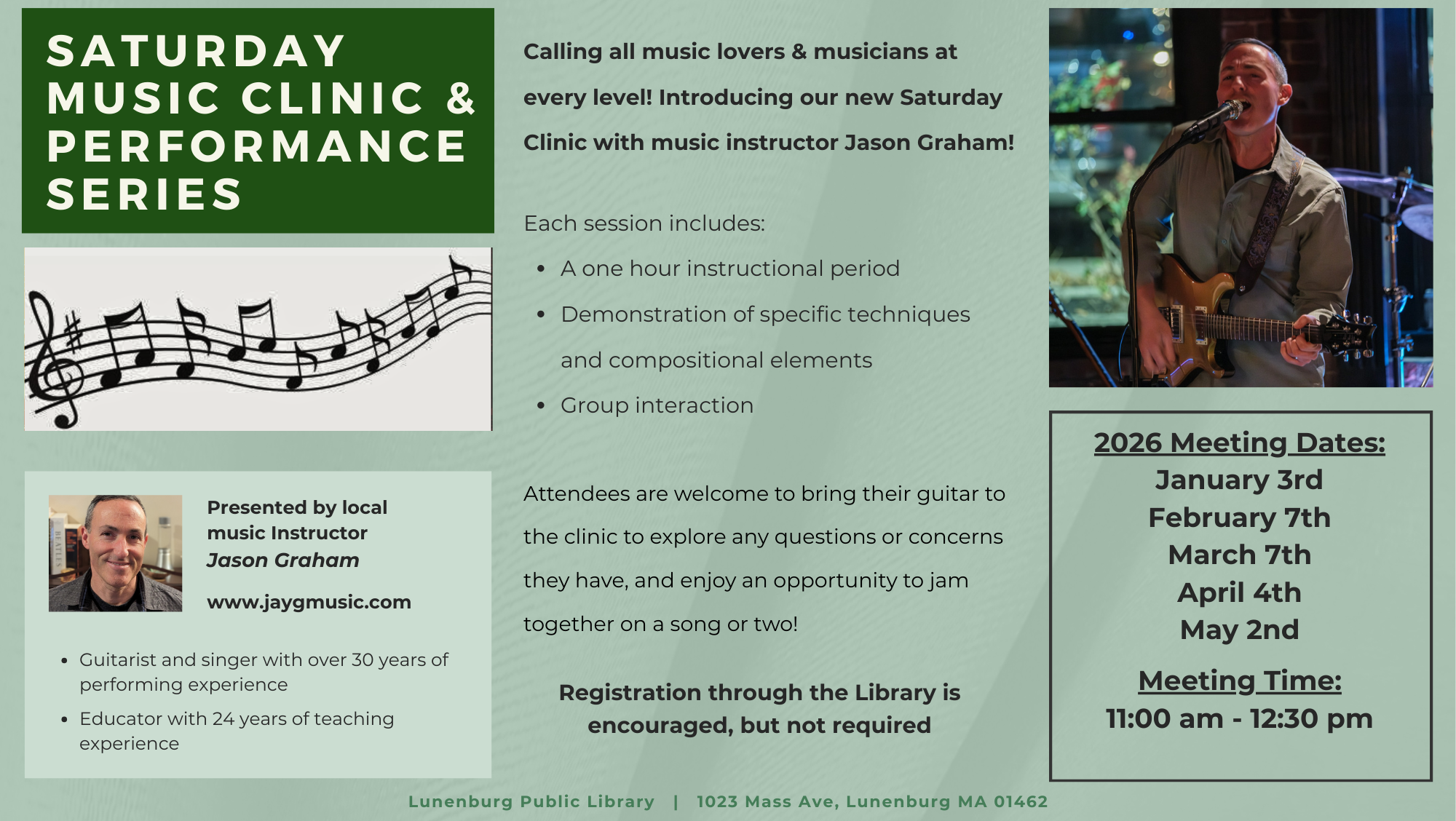 Join us on the first Saturday of the month for an interactive performance and clinic series with local music teacher and performer Jason Graham. Each session will cover a variety of musical topics and techniques ranging from beginner basics to more advanced concepts.