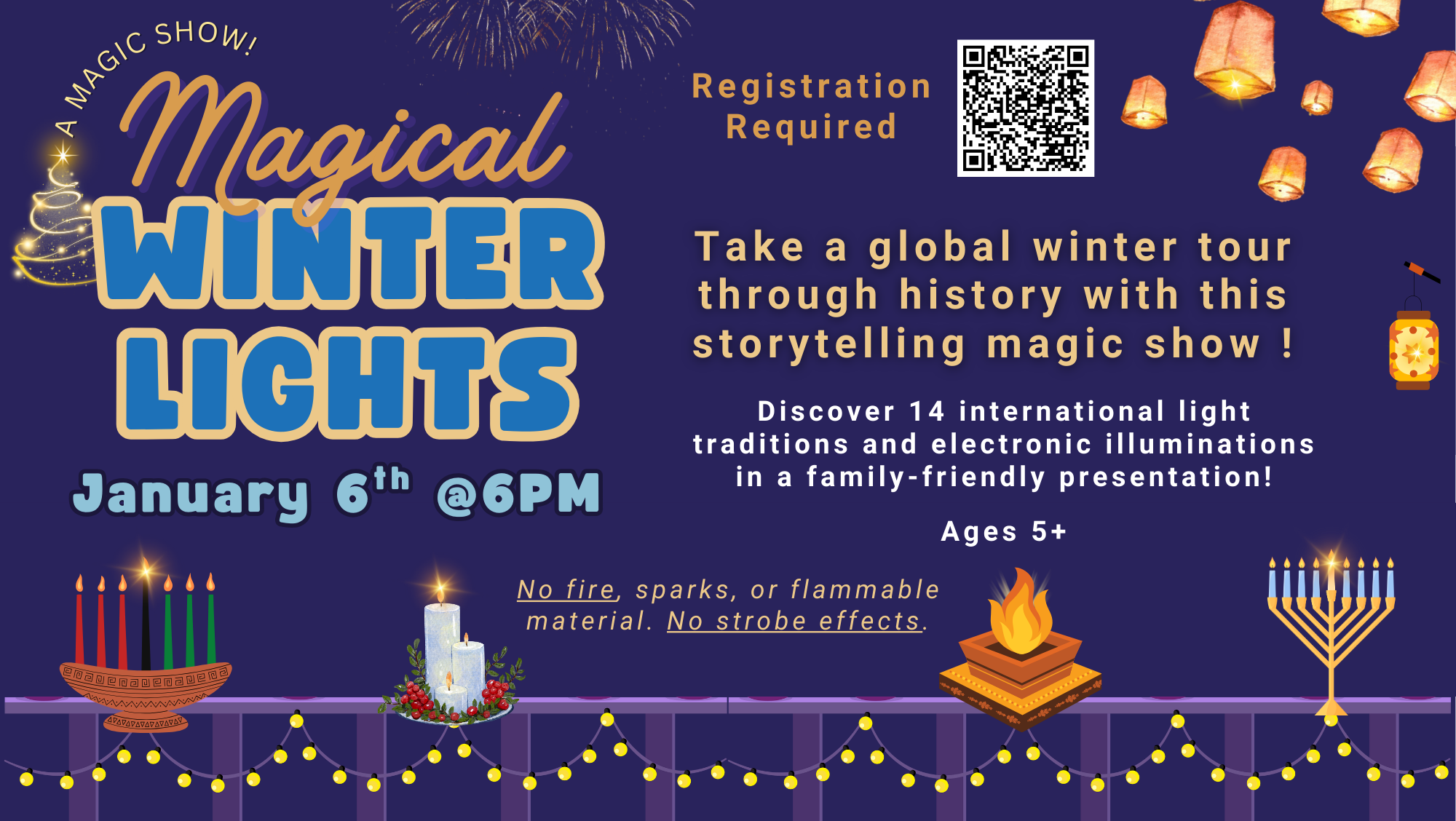 Join us at the Library as we explore 14 light traditions from early fire festivals, celestial symbolism, meanings behind certain candles and lanterns, and end with electronic illuminations in a family-friendly show (ages 5+ recommended).