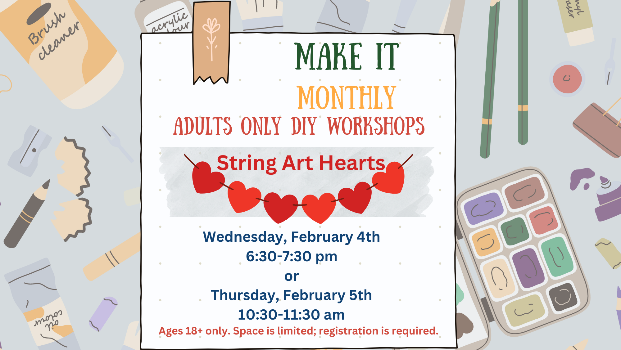Whether you’re a seasoned crafter or just curious to try something new, each session offers a relaxed, judgment-free space to explore fun DIY projects, learn new techniques, and connect with others who share your creative spark. >> Ages 18+ <<