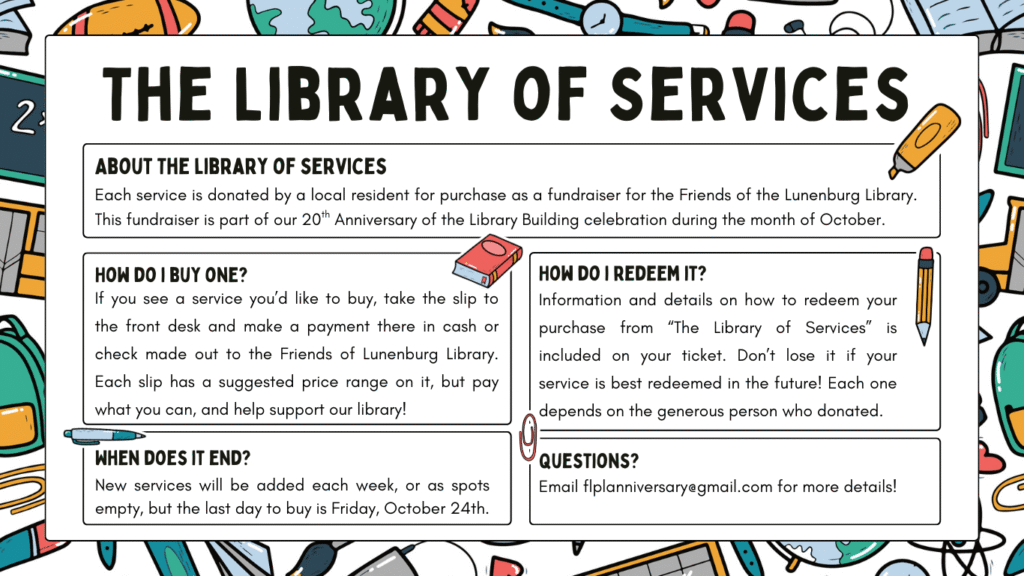 Patrons can purchase donated services offered by generous local businesses and volunteers, with all proceeds supporting the Friends of the Lunenburg Public Library.