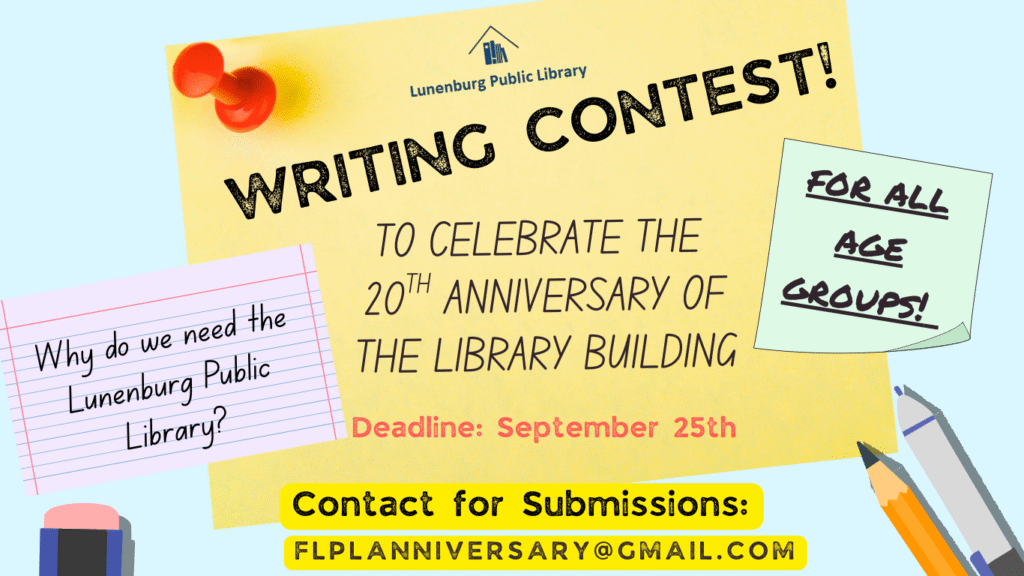 As part of the celebration, we’re excited to launch a writing contest for all ages! This year’s theme is: Why do we need the Lunenburg Public Library?