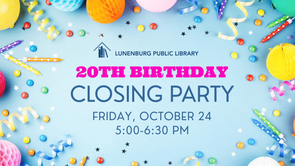 We’re kicking off our month-long celebration with welcoming remarks from volunteers who have been working on the 20th Anniversary project, as well as a presentation by the Lunenburg Historical Society on the history of our town’s libraries.