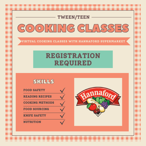 The library is excited to partner with Hannaford in Lunenburg to bring you a fun and interactive cooking program! Join us for a series of virtual cooking classes led by Brittany Wujek, Hannaford’s in-house nutrition expert.